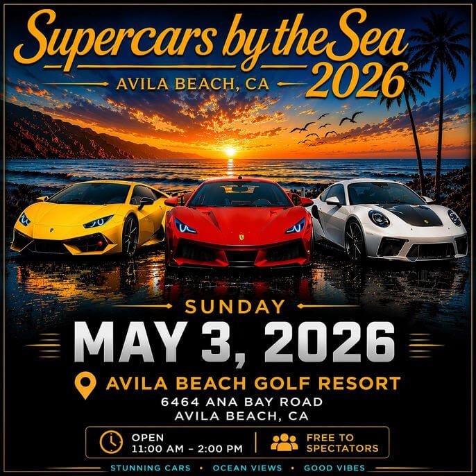 Avila Beach Golf Resort 6464 Ana Bay Rd, Avila Beach, CA, United StatesRegistration is Now Open for the Fourth Annual Supercars by the Sea Event to be held on Sunday, May 3rd, 2026! Central Coast Supercars and the beautiful Avila Beach Golf